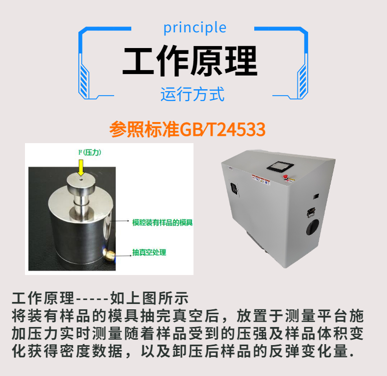 工作原理:將裝有樣品的模具抽完真空后,放置于測(cè)量平臺(tái)施加壓力,并實(shí)時(shí)測(cè)量隨著樣品收到的壓強(qiáng)及樣品體積變化獲得密度,以及卸@壓后獲得反彈變化量.