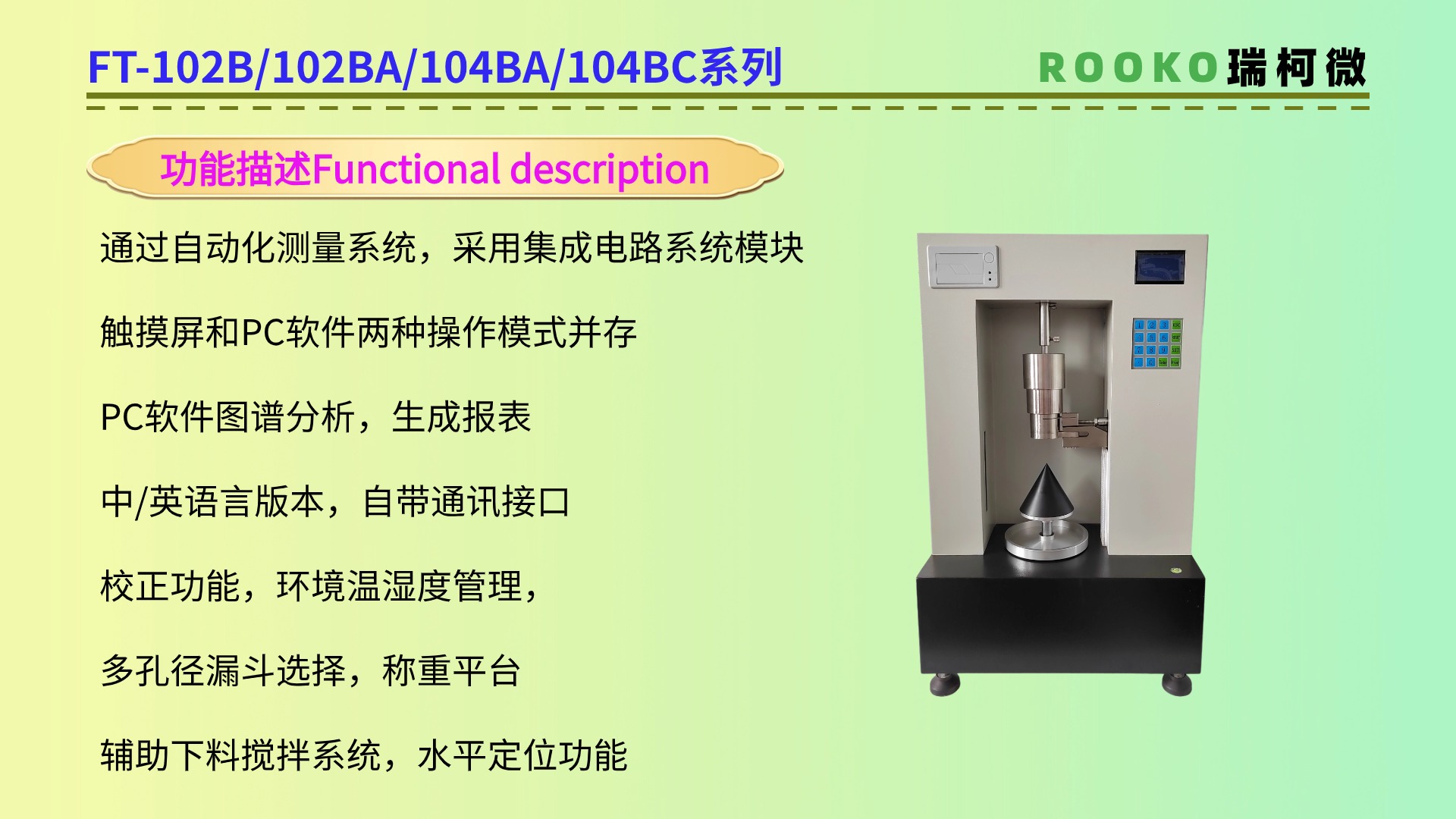 特點:休止角測定儀通常具有測量準(zhǔn)確、操作簡便、重復(fù)性好等特點。此外,一些休止角測定儀還具有自動化測量、數(shù)據(jù)記錄和分析等功能如FT-104BA。