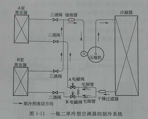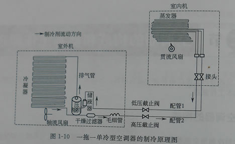 (1)單冷一拖一型 典型單冷一拖一型空調(diào)器的制冷系統(tǒng)由壓縮機(jī),冷凝器、過濾播、毛細(xì)管、截止閥、蒸發(fā)器構(gòu)成。