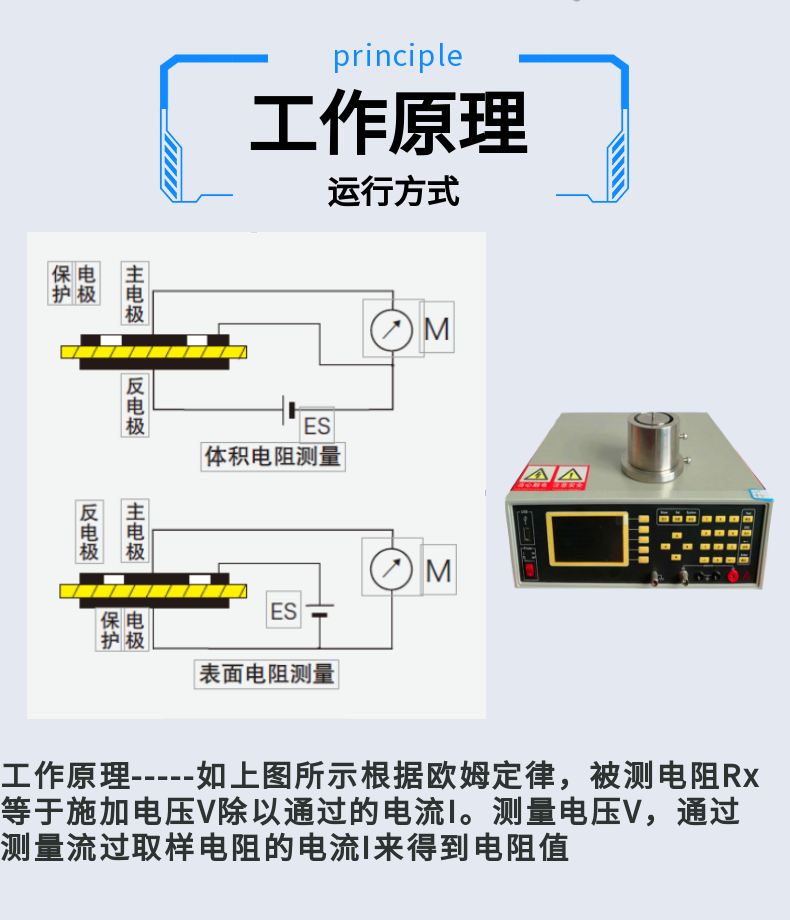 2、液晶顯示: 電阻、電阻率、電導(dǎo)率、電流、電壓、可輸入測試樣品數(shù)據(jù)(圓柱:直徑,高度;方體:長*寬*高)單位可以切換(mm、cm、m)