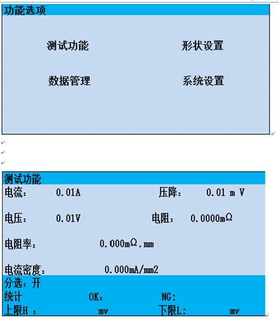 2. 液晶顯示屏幕,直讀電阻,電壓降,電阻率,測試量程
