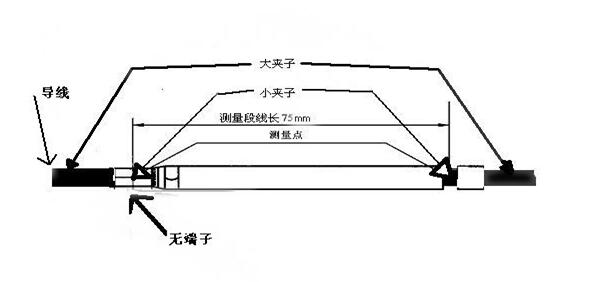 如上示兩圖中,圖1導(dǎo)線首端帶有端子,測量75mm長帶端子導(dǎo)線的兩端壓降,記錄數(shù)據(jù)備用;圖2中導(dǎo)線不帶端子,直接測量75mm長導(dǎo)線的兩端壓降,記錄數(shù)據(jù);用圖1中測得的壓降減去圖2中測得的壓降即為被測端子的壓降。